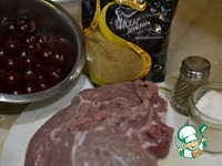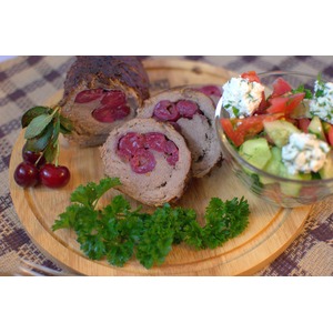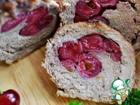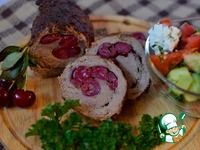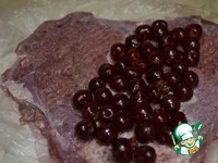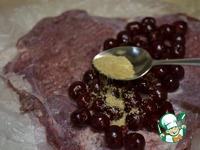 Распределяем сахар по вишне, скатываем мясо в плотный рулет и закрепляем ниткой (у меня обычная, сложенная в несколько раз) |