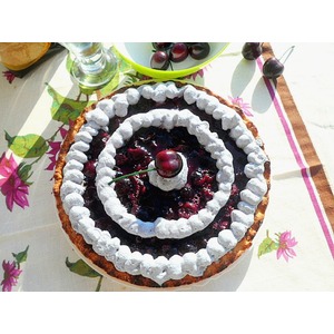 Описание: Песочный тарт, нежный ванильный заварной крем с добавлением взбитых сливок, черешня в форме желе и нежная меренга на основе черешневого сиропа. Вкусно, нежно, непринуждённо, сочетание кисло-сладкого, кремового и рассыпчатого.