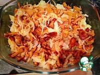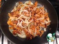 Грибы нарезать не очень мелко. Лук очистить, помыть, нарезать полукольцами. Обжарить лук с грибами на оливковом масле минут 7. |