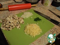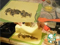 Берем наше отдохнувшее тесто, на одну половину теста выкладываем подушку из сыра, а сверху начинку грибами. |