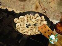 Разогреваем сковородку и добавляем подсолнечное масло, теперь когда масло разогрелось обжариваем лук и грибы, пока они не станут мягкими. |