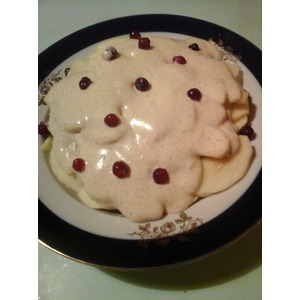 Залить полученной смесью яйца и яблоки. Можно украсить клюквой или брусникой. |