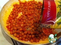 В сковороду с нутом добавить сухой орегано, примерно чайную ложку, и посолить по вкусу. |