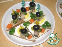Бутерброды "под водочку" - заварной хлебушек, сливочное масло, яйцо, морковь, петрушка, селедочка, маринованый огурчик, маслинка. |