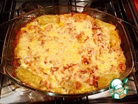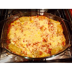 Все составляющие блюда готовы, можно приступит к сборке. А тут все просто. Берем макарошку и каждую наполняем фаршем. На дно формы для выпечки выкладываем равномерно часть соуса, и на него макароны. |