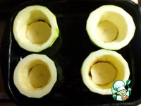 Для начала очищаем кабачки, отрезаем попки. Кабачок разрезаем поперек напополам и аккуратно вычищаем семена. Ставим узким горлышком вниз на заранее смазанный маслом противень. |