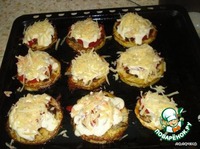 Приготовить начинку: грибы (если сухие, сначала, понятно, сварить) пережарить с луком. На противень выкладываем колечко кабачка, ложку начинки, дольку помидора. Заливаем майонезом с чесночком и посыпаем тертым сыром. На 15 мин. в духовку. И все! Гарнир на ваше усмотрение.