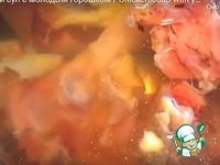 Курицу разрезать на порционные куски. Положить в холодную воду, сварить бульон, добавив в начале варки горошинки перца, а в конце - лавровый лист. |