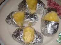 Готовую картошку надрезаем, немного не доходя до основания. Раскрываем две половинки и ложкой разминаем печёную картошку. Добавляем на картошку 1 ч. ложку сливочного масла |