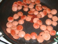 Пока картошка запекалась, мы нарезали сосиски кружочками и обжарили на сливочном масле |