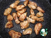 В сковородку налить достаточное количество растительного масла, и обжарить курочку до корочки ( жарить не долго, не пересушить!) |