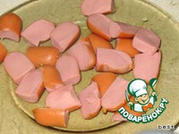 Лепить аккуратненько лепешки и во внутрь класть кусочек сосиски. |