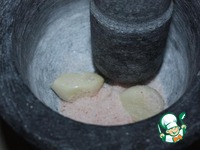 В ступке растолочь чеснок с солью. В рецепте используется розовая гималайская соль, но, если у Вас ее нет, можно использовать обычную. |