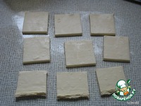 Слоеное тесто разморозить при комнатной температуре. На смазанном маслом столе разрезать тесто на равные части. |