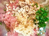 Смешиваем фарш, шампиньоны, лук зеленый, порезанные мелким кубиком, яйцо, ваши любимые специи. Солим-перчим по вкусу. Добавляем мелко порезанную 1 луковицу. |