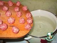 Как только вода закипела и тефтельки всплыли, кладем галушки. Обязательно при этом помешиваем, чтобы галушки не прилипли ко дну кастрюли. |