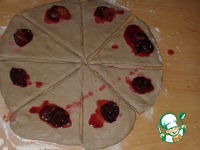 Готовое тесто разделить на 2 части. Каждую раскатать в круг и разрезать на 8 сегментов. На широкую часть положить сливу без косточки. Сок от слив оставить для глазури |