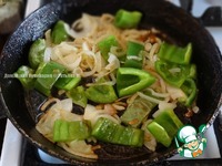 В другой сковороде обжарить лук (полукольцами), перец - кусочками до легкой корочки с добавлением коричневого сахара; |