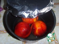 Выложить нектарины в огнеупорную посуду, залить горячим сиропом и накрыть фольгой. Запекать при темп. 180гр. 20 минут. |
