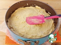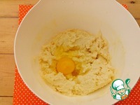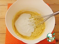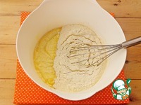 Во взбитую массу из сахара, масла и яиц высыпать одну часть мучной смеси. Перемешать. |