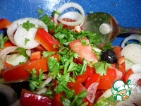 Огурец, помидор, перец порезать дольками, лук кольцами. Добавить целые маслины. |