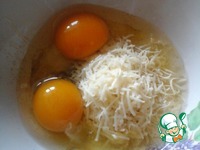 Растопить на сковороде масло и 2 столовые ложки влить в мисочку. Добавить манку, соль, перец, 2 ст. л. тертого сыра, яйца. |