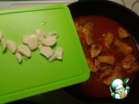 Режем чеснок пластинками. Через 25-30 минут добавляем его в сотейник, солим, перчим, добавляем приправы по вкусу. И оставляем еще на 10-15 минут. |