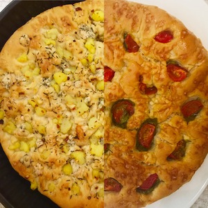 Описание: Увидела недавно этот рецепт и влюбилась в него! На красивой кухне двое прекрасных мужчин, Джейми Оливер и Дженнаро Контальдо, в строгих костюмах готовят итальянский хлеб... Что еще нужно женщине?) Понравилось еще и то, что готовят они не из пшеничной муки, а из цельнозерновой! Конечно не сильно, но всё же поприятнее для нашей фигуры!) Начинки покорили меня окончательно! С помидорами черри и свежим базиликом-максимально итальянский вариант! Ну и почти белорусский-с картошкой и сыром!) Фокачча получается невероятно вкусной: хрустящей снаружи и очень мягкой и нежной внутри! Заходите и угощайтесь, любимые поварята!