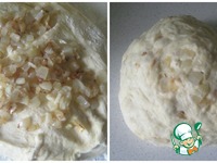 Припыляем стол мукой, обминаем тесто. Добавляем обжаренный лук и чеснок, вмешиваем его в тесто. |