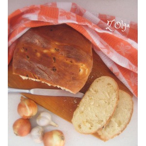 Описание: Нежный, невесомый хлеб на сыворотке с луковой и чесночной ноткой во вкусе! Идею этого хлеба вычитала на хлебопекарском сайте, с небольшими моими изменениями предлагаю его попробовать!