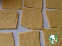 Углы соедините по диагонали над персиком, выложить на слегка смазанный маслом противень. Выпекать при 200- 220. градусах,20-25минут. Готовые изделия посыпать сахарной пудрой. Приятного чаепития!)) |