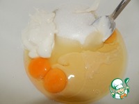 Смешать яйца, сахар, сгущёнку и сметанку |
