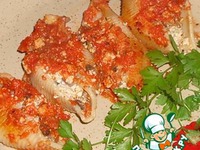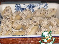 Ракушки начинить курино-грибным фаршем, выложить в форму. Если фарш еще остался, добавить его в томатный соус. |