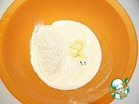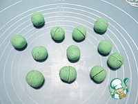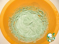 Добавляю мягкое сливочное масло, муку, просеянную с разрыхлителем, ванилин, воду, зеленый краситель (вместо красителя можно использовать шпинат или чай матча). |