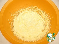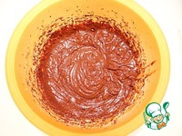 Добавляю муку, просеянную с разрыхлителем, растопленный в микроволновой печи темный шоколад, сразу тесто немного взбиваю миксером. |