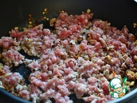 В это время займемся начинками. Лук мелко режем и обжариваем на растительном масле. Добавляем фарш, солим. |