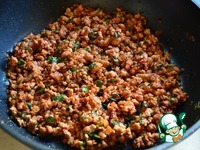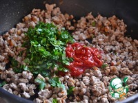 Когда фарш побелеет, добавляем ложку томатной пасты и нарезанную петрушку. Перемешиваем, оставляем протушиться минуту-другую. |