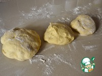 Тесто обминаем и кладем на рабочую поверхность. Делим его пополам, и одну из половин в свою очередь снова наполовину. |