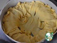 Одну из меньших частей теста раскатываем в круг, равный размеру формы. Затем делаем по краю 12 надрезов, оставляя центр целым. Перекладываем в форму и выкладываем на рулет с мясной начинкой. |