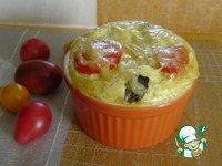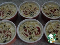 Сыр натереть на терке, помидоры нарезать кружочками. Порционные формочки (можно взять одну большую) смазать маслом, посыпать тертым сыром и положить по кружочку помидора. |