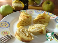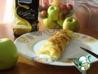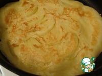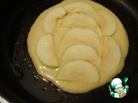 Разогретую сковороду смазываем маслом и наливаем в неё тесто. Сковороду берём большого диаметра. Выкладываем сверху дольки яблок столько, сколько поместится на блине. |