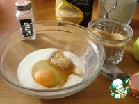 В чашку наливаем кефир, разбиваем яйцо, добавляем сахар и соль. Всё венчиком взбиваем. |