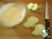 По ложке добавляем муку, смешанную с разрыхлителем. Тесто не совсем жидкое. Яблоки режем тонкими пластинами. |