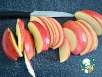 Два красных яблока, не очищая кожуры (удалить только сердцевину с косточками), нарезать тонкими дольками, и выложить их по кругу на яблочное пюре. |