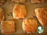 Духовка на 220 градусов. Разрезаем острым ножом на 9-12 кусочков, смазываем яичной смесью, выкладываем на пергамент, выпекаем 12-17 минут. Смотрите по румяной корочке. |