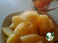 Крупно нарезанный картофель отвариваем, а воду, в которой он варился, сливаем в какую-нибудь емкость (она нам понадобится). |