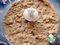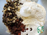 Добавляем изюм, орехи и муку. Перемешиваем. |