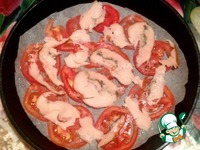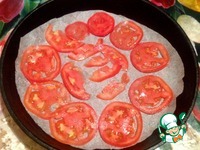 Форму для запекания выстилаем пекарской бумагой. Тонкими кольцами/ полукольцами нарезаем помидор и выкладываем поверх бумаги, оставляя свободное место. |