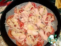 Далее тонко нарезаем ветчину, выкладываем поверх помидор, также оставляя свободные местечки. |