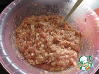 А теперь по-существу:). В наш фарш (у меня курино-свиной) добавляем жареный лук, измельченный чеснок, вбиваем яйцо, солим, перчим и хорошенько размешиваем. |